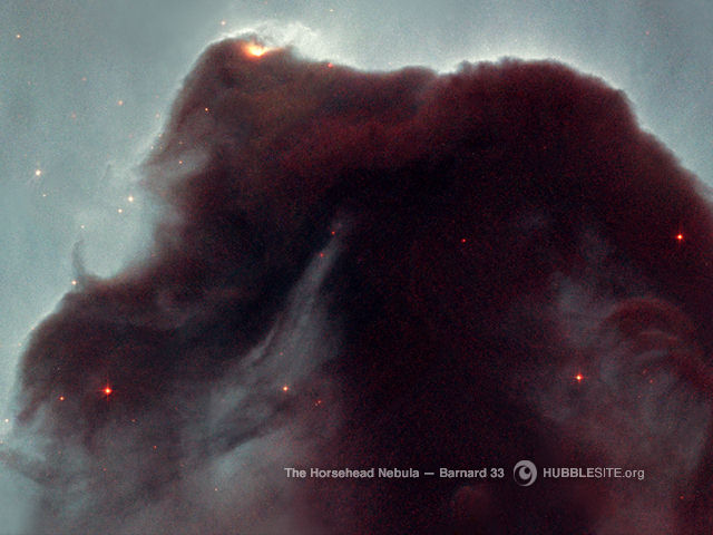 Nebula kepala kuda adalah sebuah awan gelap dingin dari gas dan debu, membayang dengan latar nebula terang IC 434. Daerah terang di puncak kiri adalah sebuah bintang muda yang masih berada dalam gas dan debu kelahirannya. 1600 tahun cahaya.